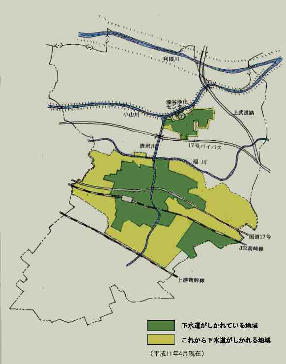 下水のゆくえ 深谷市では,1974年(昭和49年)から,大きなコンクリート管などをうめる大がかりな下水工事を始めました。 そして1985年4月,上敷免に浄化センター(下水しょり場)ができました。現在、浄化センターでは,1日に学校のプールで約40ぱい分の水をきれいにしています。深谷市では,下水道を利用できる地域を広げています。