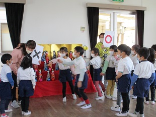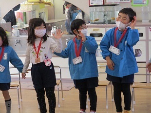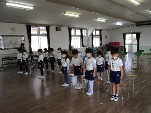 「まん延防止等重点措置」の延長を受け、例年実施しております保育参観の持ち方の変更にご理解いただき感謝いたします。22日に分散型保育参観の計画表を配布しました。第一希望を優先に計画表を作成しましたが、思い通りにならなかった保護者の皆様のご理解に感謝いたします。参加人数を踏まえ三密を考え計画表を作成したことにご理解下さい。参加に際しましては、配布しました健康確認票の提出をお願いいたします。