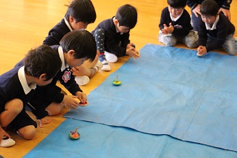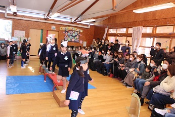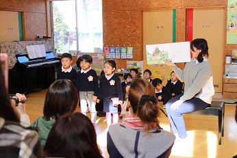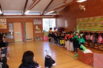 3月1日(木)は今年度最後の保育参観日を実施しました。各クラスでは、劇や絵本の暗唱を発表しました。5歳児は、劇です。きりん組は大きな声できれいに歌を歌うのが得意です。手作りの大型カルタでは親子対決も見られました。4歳児は、園長がお部屋に行く度に、「聞いて」「聞いて」と絵本の自分の分担を読んで聞かせてくれました。暗唱できる子がたくさんおり、驚きました。きっとお家でも保護者の方を前に何度も練習したのでしょう。3歳児は、「大きなかぶ」の劇です。本当に楽しそうに発表できていました。みんなで一つのことに取り組んで、仕上げていくことの体験です。十分、成長ぶりを発揮できた発表だったことでしょう。保護者の方々が懇談会の間は、園児たちは大ホールで「コマ回し」、誰のが一番最後まで回っているかを競ったり、緊張から解放されてのびのびと楽しんでいました。