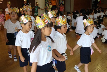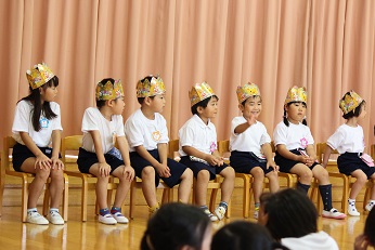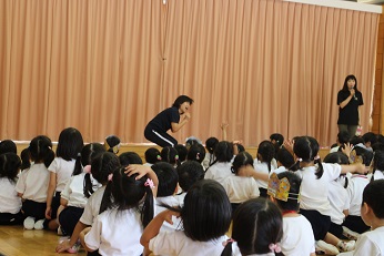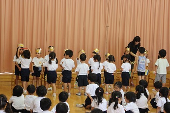 6月26日(火)は6月生まれの誕生日会を行いました。入場の後は、先生からのインタビューです。好きな食べ物や大きくなったらという夢を話しました。3歳のりす組さんもインタビューにしっかりと答えていました。緑が一層濃くなって、たくさんの果実が実り始める生命力を感じる季節生まれのお友達、元気に誕生日会を迎えました。先生たちからのプレゼントは、ジェスチャーゲームです。夏らしいお題に先生方が挑戦していました。