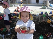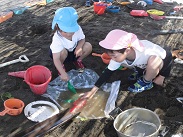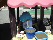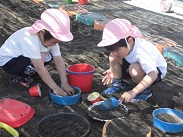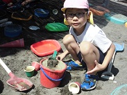 園児が思い思いに砂遊びを行っています。それぞれの子が自分なりの目的をもって砂と戯れています。この遊びを通して、砂の感触を味わうとともに造形の心を育てていきます。