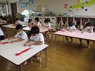 「まん延防止等重点措置」の延長を受け、例年実施しております保育参観の持ち方の変更にご理解いただき感謝いたします。22日に分散型保育参観の計画表を配布しました。第一希望を優先に計画表を作成しましたが、思い通りにならなかった保護者の皆様のご理解に感謝いたします。参加人数を踏まえ三密を考え計画表を作成したことにご理解下さい。参加に際しましては、配布しました健康確認票の提出をお願いいたします。