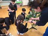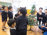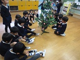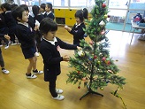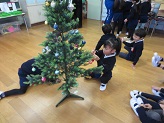 サンタクロースがやってくる 明日のクリスマス会のためにツリーをみんなで飾りました。教室にはクリスマスソングが・・・。もみの木、トナカイ、サンタさん そして、プレゼント