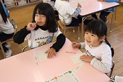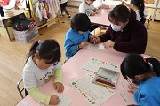 ばら組のみんなは、郵便やさんごっこで使う手紙を書きました。平仮名の一覧表を見ながら文字を書きました。こんな活動を通して文字や文章も覚えていきます。