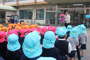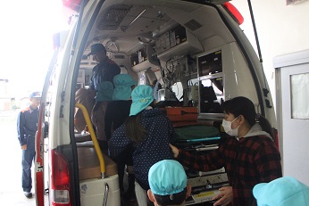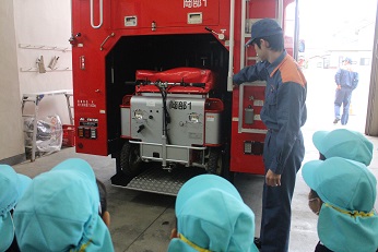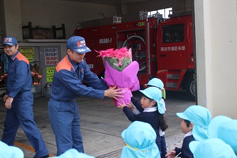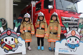 11月22日(木)、今日は23日の勤労感謝の日の前日です。5歳児は、深谷消防署岡部分署へ出かけました。いつも私たちの「命」を守ってくださる消防士さんたちに「ありがとう」を伝えに出かけました。救急車の中を見学させていただいたり、消防車の説明をしていただきました。園児たちは、消防服とヘルメットを着させていただき、写真をパチリ。よい記念になります。ありがとうございました。そして、分署長さんと①大人のいうことをちゃんと聞く②火遊びはしない、お約束をしました。