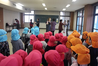 3・4・5歳児全員で、岡部公民館に行きました。公民館は私たちの暮らしを豊かにしてくださいます。いつも絵本を借りに行く図書館や習い事をしている園児もいます。公民館まつりでは絵も展示していただきました。館長さんの案内でクラブ活動を楽しんでいらっしゃるお部屋にもお邪魔しました。お忙しい時間を園児たちのためにさいていただき、ありがとうございました。