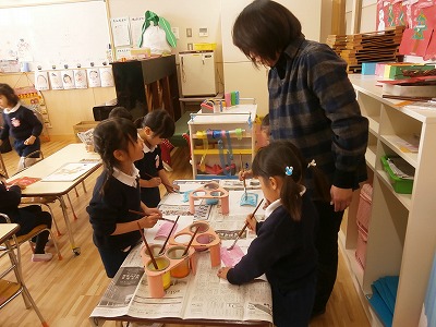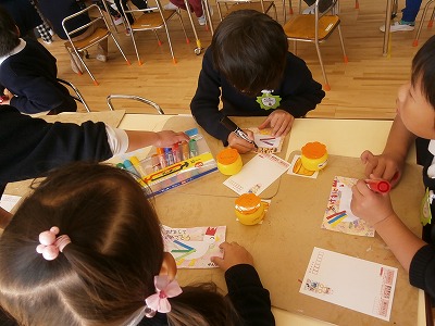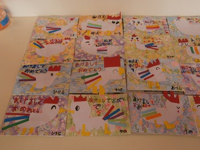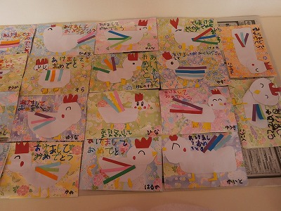 今日は年賀状を作りました。うさぎ組は、はがきに色を塗り始めましたよ。さくら組は、ニワトリの目を描いたり、「あけましておめでとうございます」を自分で書いたりしました。かわいいニワトリの年賀状ができました。完成したら、近くの郵便ポストに投函しに行きます。