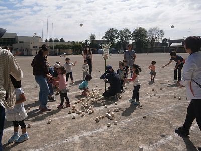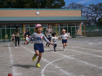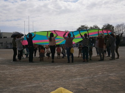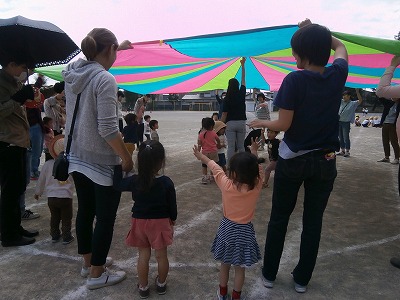 かわいいお友だちがたくさん遊びに来てくれました。一緒に運動会ごっこをしました。かけっこや、玉入れ、パラバルーンをして、体をたくさん動かして遊ぶことができました。