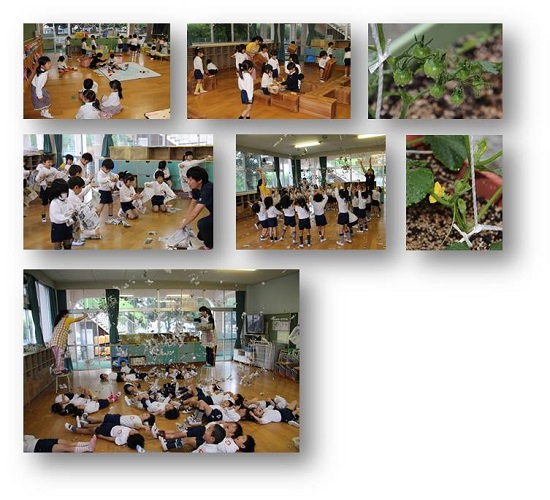 今日も雨の一日になってしましました。でも、集会室で大型ブロック遊びをしたり、新聞忍者ごっこをしたりして元気いっぱいに過ごしました。年長児が植えた野菜が恵みの雨で成長しています。
