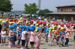 5月24日(火)の午前9時45分、本年度初めての幼児園と幼稚園みんなで「健康体力」づくりを目指した合同の取り組みである「体操マラソン」を実施しました。昨日並みの暑さが予想されたため、体操時間を少し短縮しての実施となりました。園庭で音楽に合わせて、体操をして、3分間走ります。りす組さんは園庭のトラックを、しか組さんは、外周を幼児園のみんなと走ります。自分のペースで走ります。これから、少しずつ、園児たちにも自分の目標を設定して、目標に向かって努力する活動としていきたいと思います。