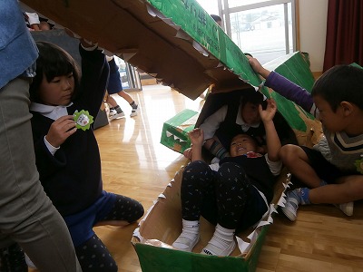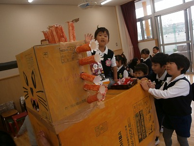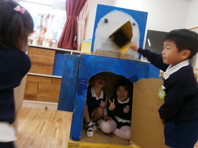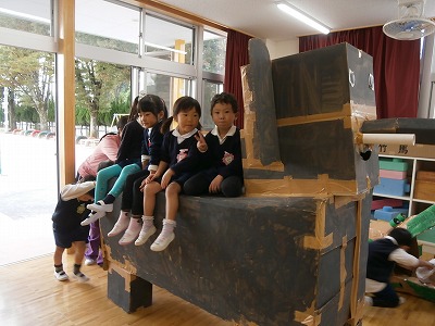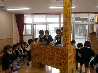昨日に引き続き、動物園ごっこをしました。今日は、うさぎ組を招待して一緒に遊びました。さくら組は動物を押してあげたり、エサをあげる手伝いをしました。お客さんがたくさん来て「大変だなー。」と言っていた年長さんも、充実感を持った顔で、かかわる姿が見られました。うさぎ組さんも、いろいろな動物に乗せてもらい、とても楽しそうでした。「大きいねー。」と、目を輝かせていた子もいましたよ。
