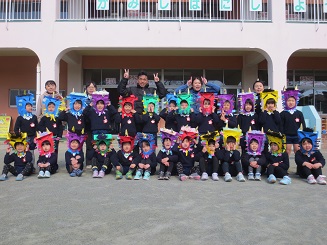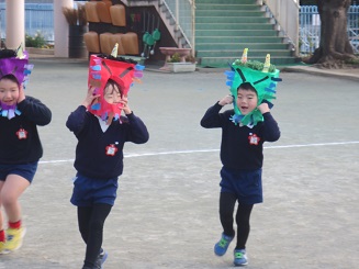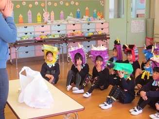 きりん組さんはごめんなさい。日野先生と実習生がさくら組と一緒にやってくれました。後日、きりん組さんも鬼の面をかぶって記念写真が撮れるといいです。月曜日は、元気に出ててこれるといいです。具合の悪い人は無理しないでください。