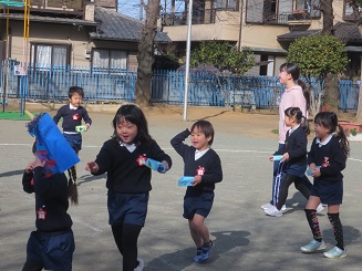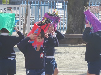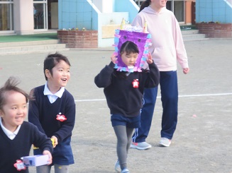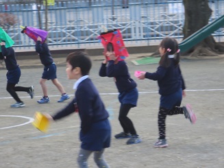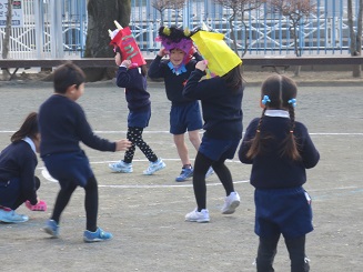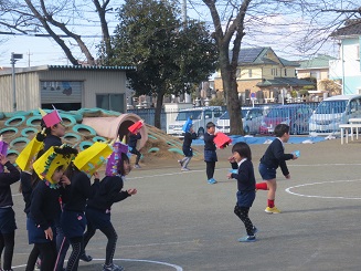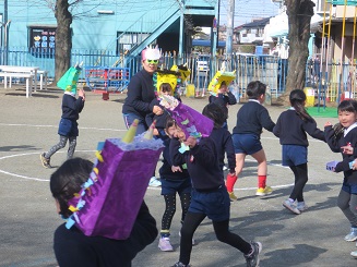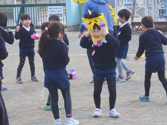 教室で、各自の退治する鬼・目標を言い合い、いざ園庭にでて・・・。