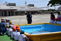 6月10日(金)にプール開きを行いました。昨日は朝から霧雨が降り続くあいにくの天候でしたが、教育委員会の方がお二人きてくださり、プールを組み立ててくださいました。園児たちは、出来上がっていくプールを目を輝かせて見守っていました。今日は、朝から晴れました。プールを組み立ててくださったことに感謝して、そして安全で楽しい水遊びの時間となるように、「先生のいうことをちゃんと聞く」というお約束をみんなでしました。テープカットし7色の紙テープが、風にまって平成28年度水遊びの時間、開始です。