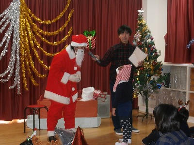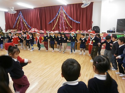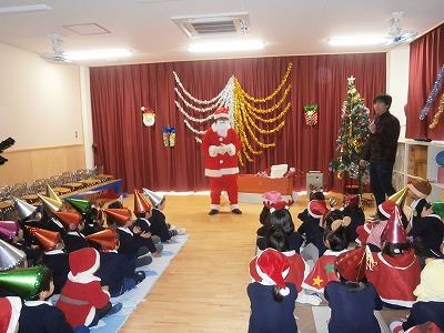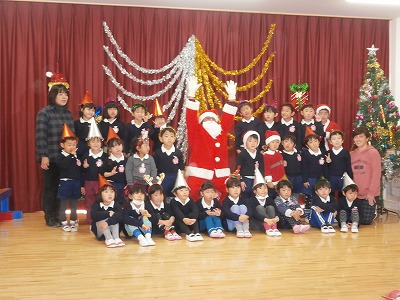 今日は、クリスマス会を行いました。サンタさんの登場に、「うわー」という歓声と、「ほんとうにきたー」という驚きの声が上がりました。 サンタさんに、聞きたいことを質問しました。中には、「What color do you like」と、英語で質問した子もいましたよ。その後一人一人プレゼントをもらい、お礼に「あわてんぼうのサンタクロース」を歌いました。 最後にサンタさんから、「来年もまた来るから、みんなお父さんやお母さんの言うことをよく聞いて、良い子で一年を過ごしてね。」「英語もしゃべれるようになると良いね。」と、お話をしてもらいました。 今日、もらったコマとかるたは、冬休み明け、幼稚園で使いますので、練習をたくさんしておいてください。
