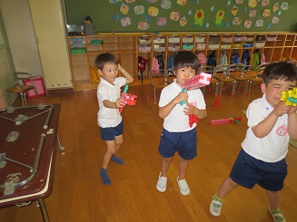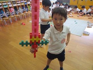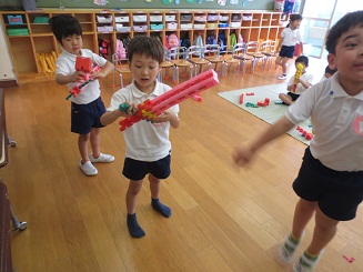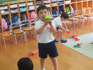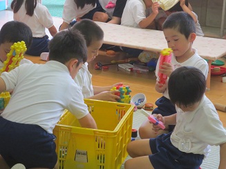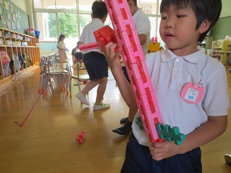 園児が夢中になるにはその面白みの理由があるようである。今日も、思いを入れて遊び込む姿があった。この遊びの中に友達とのやりとり、ルール、我慢、教えっこなど、関わりを色々とつけている。