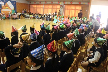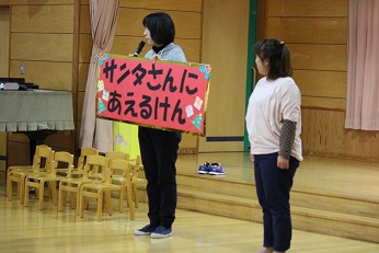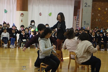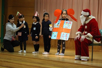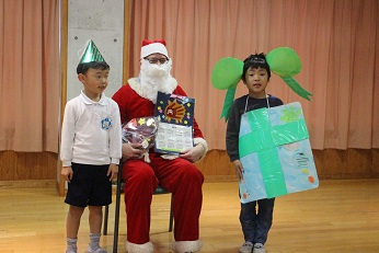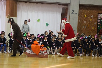 12月20日(木)はみらい幼児園おかべとおかべ幼稚園合同の「クリスマス会」でした。お歌を歌って、クリスマスを祝いました。出し物は先生方による椅子取りゲームです。楽しそうに椅子の周りをまわる先生たち、必死で応援する園児たち、みんなが一瞬で一つになりました。勝った先生は「サンタさんに会える券」、みんなで呼んでいよいよサンタさんの登場です。「どうして赤いお洋服を着ているの?」「サンタさんはどうやって良い子を見つけるの?」「どうしてツリーの上にお星さまをつけるの?」「たくさんの子供たちへのプレゼント、どうやって準備しているの?」かわいい質問が出ました。そして、最後はサンタさんから、良い子へのプレゼント。みんなもらいましたよ!サンタさん、ありがとうございました。最後に、5歳児クラスから手作りのプレゼントをお礼に渡しました。楽しい時間を