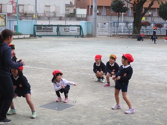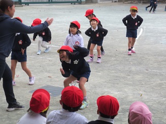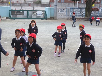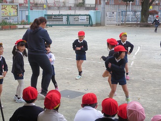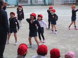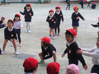 昼の外遊びの時間に先生が、園庭で音楽を流したら、自然に集まってきて踊り始めました。