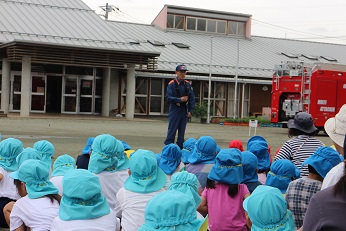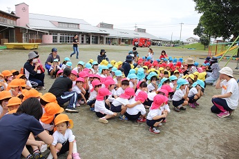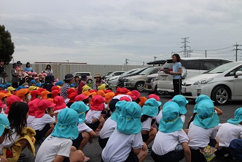 6月21日(木)は年間計画に基づいた避難訓練の日でした。園側は11番への火事の通報訓練を行い、先生方の消火訓練も行いました。園児たちは、今年度初めての第2避難所までの避難訓練を行いました。避難地までの安全を確認しながら、誘導する先生たちと、ただならぬ雰囲気に真剣な態度で臨んだ3歳児、全員が「お・か・し・も」の約束を確認し合って、園に戻りました。岡部分署から来てくださった消防士さんから、①これから花火など楽しむ季節だけれど、大人と一緒でない場面では絶対に火を扱わないこと②先生の指示をよく聞いて行動することのお話をいただき、とっても真剣にできたことをほめていただきました。
