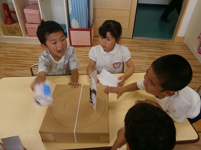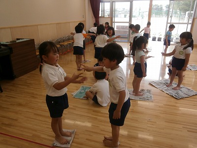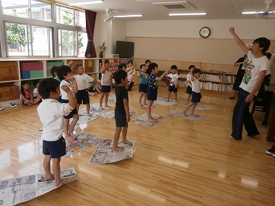 本日の活動の様子を紹介します。うさぎ組は、紙相撲を作って、楽しく遊びました。さくら組は、新聞紙遊びをしました。勝ちたいという思いがひしひしと伝わってきました。