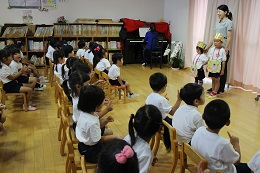 6月28日(火)は6月生まれのお誕生会でした。給食メニューもケーキがついています。今日は2人のお友だちが誕生月でした。大きくなったら何になりたいですか?好きな飲み物は?質問コーナーのあと、お祝いの歌のプレゼント、そして先生方からお話をしました。みんなでお祝いしました。おめでとう!