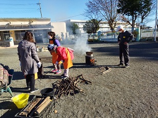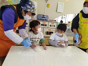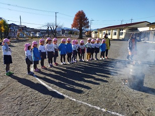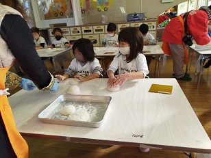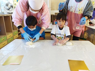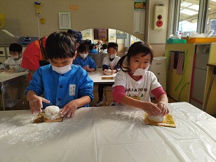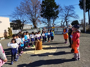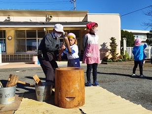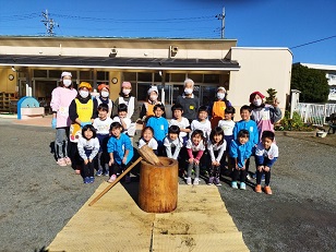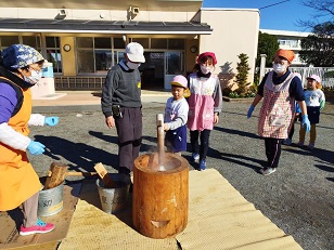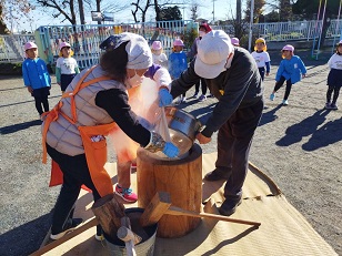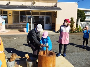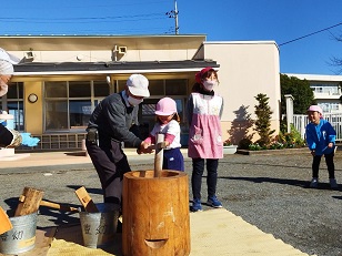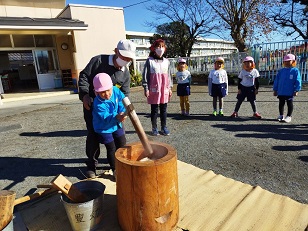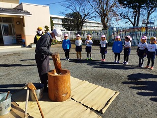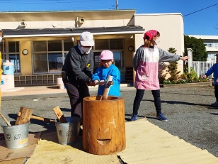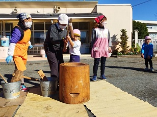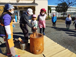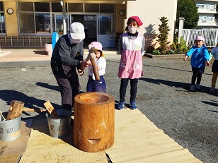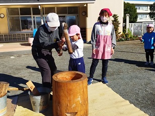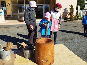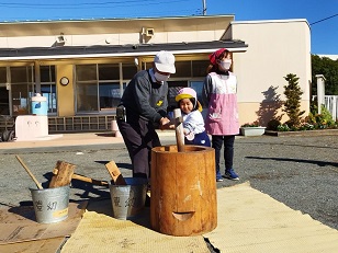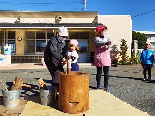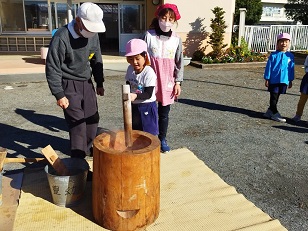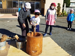 臼と杵は小学校からお借りし、子供用の杵は園児のご家庭からお借りしました。
