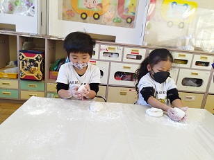 粉だらけになりながら一生懸命取り組み、自分だけのオリジナルの