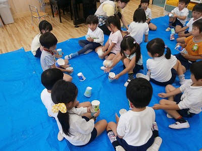 うさぎ組は、新聞を使い、リレーや、ジャンケンゲームを楽しんでいました。さくら組は、紙コップを使い、ジャンプするカエルを作り遊びました。