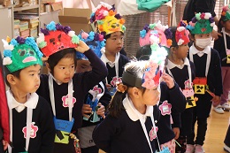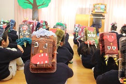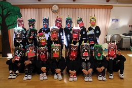 2月3日(金)は節分です。給食メニューも季節の献立です。園児たちは、今日の日のために工夫をこらして作った鬼の面をかぶって、豆まきを楽しみました。深谷市岡にある熊野神社にでかけて、豆まきをさせていただく予定でしたが、昨日から続く強風に園児の安全を配慮して、園で行いました。園長から、節分の由来や豆まきについて話をし、教務主任の先生が「ないた赤おに」の紙芝居をプレゼントしました。みんなで豆まきの歌を歌って、いざ、園庭へ。しかし、これも強風のため、無理と判断し園内の大ホールで行いました。「福は~うち、鬼は~そと」、元気で楽しい一年になりますようにと願いながら、豆まきを楽しみました。きっとよい年になります。