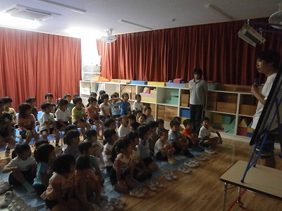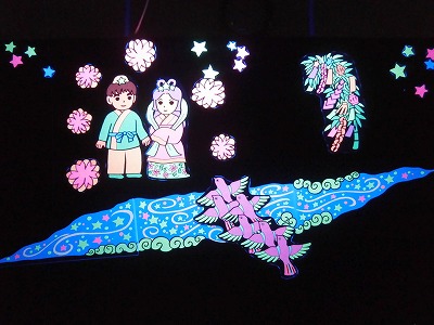 今日は七夕会をしました。リズム室に集まり、ブラックパネルシアターで、七夕の話を見ました。暗闇に浮かび上がる、天の川に「きれい~」と、歓声が上がりました。その後クラスに戻り、星のおせんべいと、ヤクルトをいただきました。