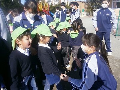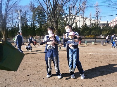 幡羅中学3年生による保育実習も今回で最後となりました。サッカー、ドッジボール、縄跳び、竹馬、凧上げ、相撲と、今回もたくさん遊んでもらい、お別れするのに、とても名残惜しそうにしている子どもたちの姿も見られました。