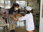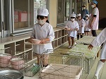 給食センターから熱々の美味しい豚汁がはいったコンテナが届きます