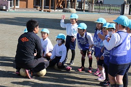11月17日(木)は、風のない、よく晴れた穏やかな日です。みらい幼児園おかべとおかべ幼稚園の5歳児園児たちがサッカー教室を体験しました。上里町のゴールドルーツスポーツクラブからお二人の指導者が来てくださいました。ボールに親しむための運動やボールを蹴ってカラーコーンに当てる運動などサッカーを楽しく体験できるように指導してくださいました。子どもたちも笑顔で、真剣に取り組んでいました。楽しかったァ、園児たちの感想です。この中からもサッカー少年少女が育つ第一歩になったかもしれません。