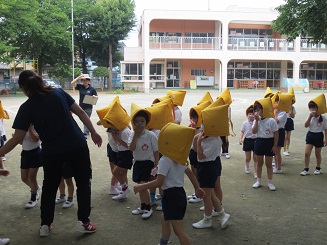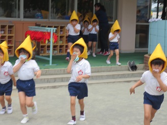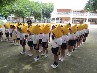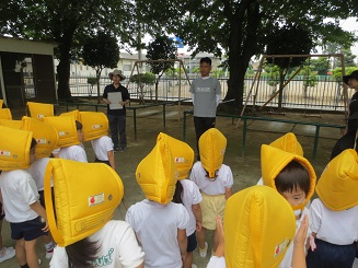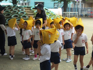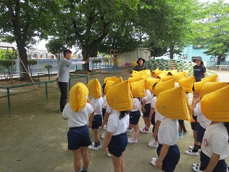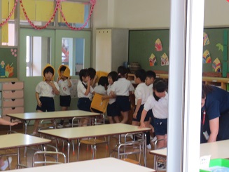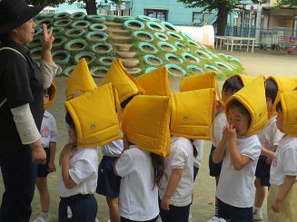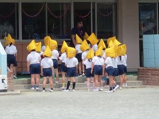おしゃべりしていては、先生の話が聞こえません、素早い行動もできません。黙って素早く避難する訓練です。 今回想定は、地震発生から、火災発生となり避難しました。園児は、机の下にもぐり頭や身を守ります。火災発生のため園にある防空ずきん、ハンカチを口に当て煙り等吸わないようにし避難します。基本の動作です。そして、火災発生の場所から鉄棒側まで素早く逃げます。 きりん組園児は初めてなため、どこに逃げるかわからず教室の中にとどまっている子・・・。担当が一緒に手を繋ぎ連れ出しました。まだ、火事ということや、どのように逃げるのか説明だけではわかっていないかもしれません。全体は、よくできていました。また、よい経験をしました。 園児も先生もこの反省を元に、次回に生かします。次回は、災害の想定が違うかもしれませんが、基本行動は同じです。今回よりも早く、おしゃべりせず、安全に避難できるようにします。 私たち職員も一人一人の様子と行動を見て反省しました。何回やっても、慢心は危険です。命・安全・真剣でなければ訓練にはないからです。有り難うございました。