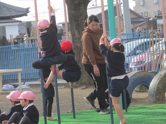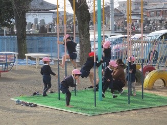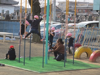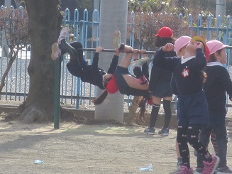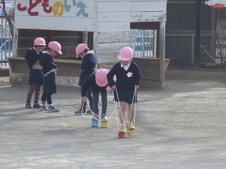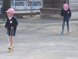 ぽっくり遊び、竹馬、鬼ごっこ、鉄棒のぶら下がり、追いかけっこなどなど、時間を気にしないで思いつくままに・・・。 少しやり始めたかと思うと、友達に誘われてまた違う遊びにうつります。どれをやっていても楽しそうな顔や声が聞こえる。楽しい上柴西幼稚園。 いろいろな工夫遊び、これも子どもの発想や創造力の特性のようです。無邪気な子ども心・・・。やっぱりいいな。