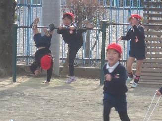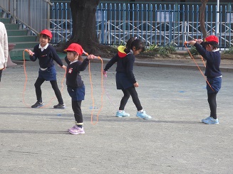 こちらでは、縄跳び遊び、スキップとびを工夫してやっていた子