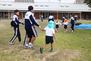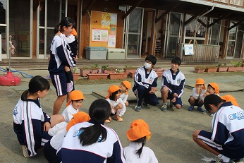 10月15日(月)、今日で岡部中学校の3年生の幼稚園訪問は最終です。4クラスの生徒さんたちが、1クラスずつ幼稚園を訪問して、園児たちと遊び、絵本の読み聞かせをしてくださいました。いっぱい運動して、いっぱい甘えられて、園児たちにとっては楽しい時間となりました。中学生の皆さんには、幼児のどんな姿が映ったのでしょうか?