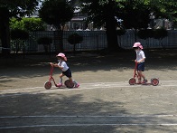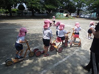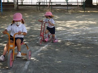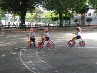 三輪車は足がペダルに届かない子もいたね。でも大丈夫、ペダルに力を入れて、こいでるとそのうち乗れますよ。