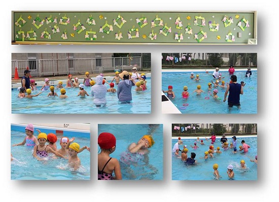 今日から、上柴西小学校のご好意で、年長児が小学校のプールに入り、プール遊びを楽しんでいます。水の苦手な子どもたちも不思議になじんで歓声を上げていました。ありがとうございます!