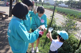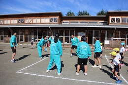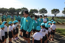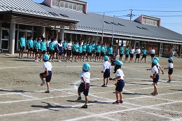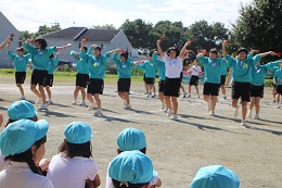 10月7日(金)は秋晴れの良い天気です。今日は、岡部中学校3年4組の生徒さんが、家庭科の授業の保育体験でおかべ幼稚園を訪問してくれました。班ごとにいっしょに遊んだり、明日が運動会なので、しか組はソーラン節を披露しました。岡部中学校の3年4組も、ソーラン節を踊ってみせてくれました。迫力があって、切れがよく、幼稚園も保育園もみんな顔を出して、演技を楽しみました。かっこいい姿に感動しました。そのあと、色別リレーを幼稚園、中学校混合チームで楽しみました。楽しいあっという間に過ぎた1時間10でした。ありがとうございました。