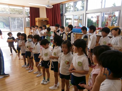 うさぎ組は、楽器をみんなで演奏しました。トライアングルを、初めて使いました。リズムに合わせ演奏する練習をしました。