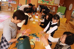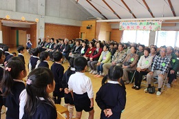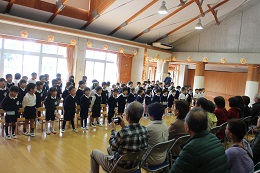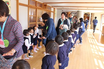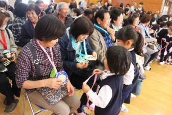 11月2日(木)は祖父母参観日を行いました。第1部は、大ホールでごあいさつの後、園歌や秋の歌をプレゼントしました。そして、第2部は園庭やお部屋で一緒にあそびます。お手玉やあやとり、折り紙、そしてコマ回しなど教えてもらいながら、楽しく過ごしました。外では、10月28日の土曜保育で作ったばかりのぽっくりや竹馬の練習をてつだってもらったり、遊具でいっしょに遊んだりとあっという間に時間が過ぎました。第3部は、一人一人が心を込めてつくったメダルをプレゼントしました。笑顔いっぱいの楽しい温かい会となりました。ご参加ありがとうございました。