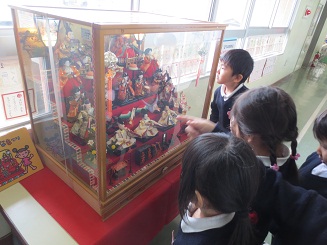 桃の節句もまもなく、昨日は幼稚園の玄関にお雛を飾りました。