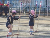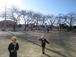 縄跳び3回跳べたよ。僕は17回跳んだよ。後ろ跳びもできたよ。すごいねー。先生私は竹馬やるから見ていて。