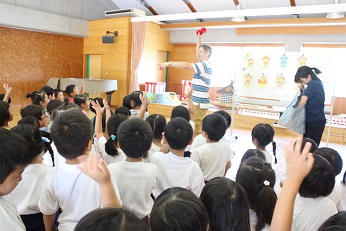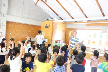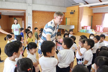 6月22日(金)は、岡部中学校からロバート先生がきてくださり、4・5歳児は「英語」の世界を楽しみました。年齢ごとにみらい幼児園おかべと幼稚園が一緒に遊びました。色ボールであそんだり、「How are you 」への自分の状態を英語で表す言葉を楽しくダンスをしながら、覚えました。みんな、とても意欲的で、どんどんロバート先生に接近していきます。後でみえたお客様に「Hello!」とご挨拶をしていた園児もおり、ほほえましく感じました。
