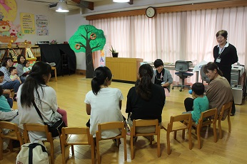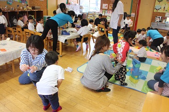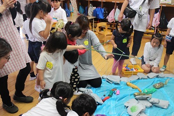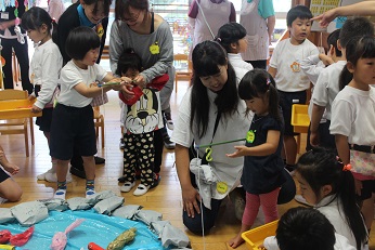 6月24日(月)は、朝から雨が降り続きました。今日は、本年度第1回目の「子育てひろば」です。9組のかわいいお友達とお母さんが参加してくださいました。お兄さん、お姉さんのお部屋でいっしょに遊んだり、きりん組さんのお部屋では、園児たちが準備したお魚つりゲームを楽しみました。教育委員会の富田先生が準備してくださったマイクに向かって、自己紹介をする場面では、しっかりとお名前、年が答えられたお友達がたくさんいました。
