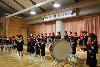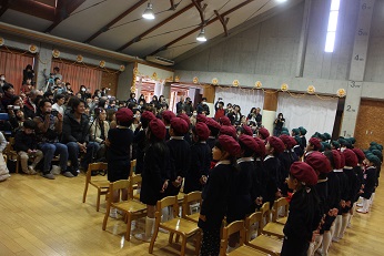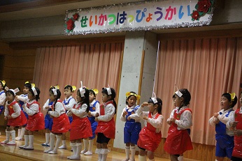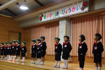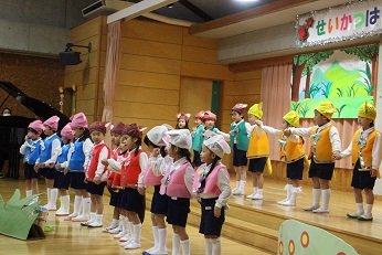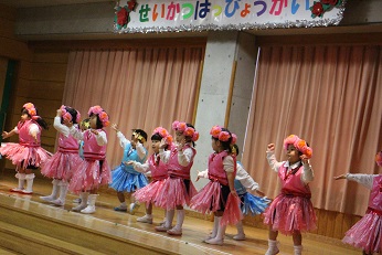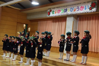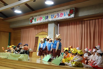 11月30日(木)は年度当初の予定を一日繰り上げた生活発表会でした。9時に開会しましたが、大勢のご家族の方に参観いただきました。おうちの方の顔が見えると、がんばるパワーが倍増するようです。園児たちは今までの練習の成果を発揮して、真剣な表情で演奏や演技に取り組んでいました。体を動かすことを楽しみ、楽器を使って音楽を奏でることを楽しみ、音楽に合わせて踊ることを楽しみ、役になりきって演じることを楽しむ園児たちには、大きな成長を感じました。きっと今日はおうちの方々にいっぱい褒められて、がんばった日々をよい思い出にしていることでしょう。これが自信につながり、園児たちは「またがんばろう」という意欲をもちます。園児たちのがんばる姿にパワーをもらうのは私たち教員でもあります。一人一人が輝いていて、素敵な発表会となりました。