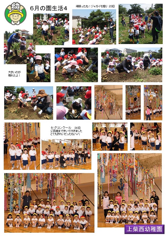 夏休みも半分を過ぎてしまいました。まだまだ休みは続きますので、それぞれ楽しい夏休みを過ごしています。園として、この夏休みを利用して、一学期の活動を写真にまとめま紹介しています。今日はその12回目です。(ジャガイモ掘り・七夕等)