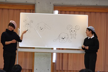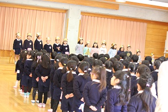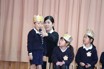 1月22日(火)、冷え込んだ朝、外に出てみると雪が舞っていました。あっという間の出来事でしたが、園児たちは「雪が降ったよ」とうれしそうに話してくれました。受験の日って降るんだよなと思わずにはいられませんでした。暖かな冬のお日様が出て、雪が降ったことも忘れる天気の中、1月生まれの誕生会をみらい幼児園おかべと合同で行いました。幼稚園では6人のお友達が1月生まれです。お歌を歌ったり、お祝いのカードをプレゼントされたり、園児たちはとてもうれしそうでした。好きな食べ物は?大きくなったら何になりたいの?先生の質問にもしっかりと答えられていました。先生たちからプレゼントは、絵かき歌です。歌といっしょにだんだん仕上がっていく絵に、みんな集中していました。きっと今頃、お部屋で誰かがやっていることでしょう。