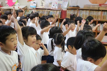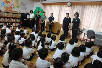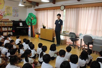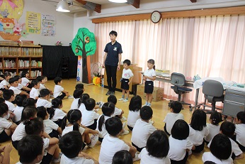 7月19日(金)、1学期の終業式を行いました。68日(入園児は65日)間の1学期、先生方から「担当以外のクラスのすばらしいところ」を発表していただきました。3歳児は泣かないで、ごあいさつが上手にできるようになったことや片づけが上手、給食をよく食べるようになったことなどが花マルでした。4歳児は、楽しく遊べるところ、あいさつが上手にできる、3歳のお友達に声をかけて一緒に遊んでくれるところ、折り紙など「やって」ではなく「ここまでは自分でやるよ」が増えたこと、お話を上手に聞けるなどをほめていただきました。実際、式の間に姿勢が一番よかったのはしか組さんです。5歳児は、年下のお友達と一緒に遊んだり、面倒をみたりできること、あいさつが他の園児の見本になっていること、給食をたくさん食べられることなどがあげられました。最近、くつそろえもみんな上手になりました。夏休み、いっぱい遊んで、いっぱい食べて、楽しく過ごしてほしいと思います。夏休みの宿題は①「おはようございます」のごあいさつ②くつ型シートをつかってくつそろえ③嫌いな食べ物にも挑戦!です。元気に会えるのを楽しみにしています。
